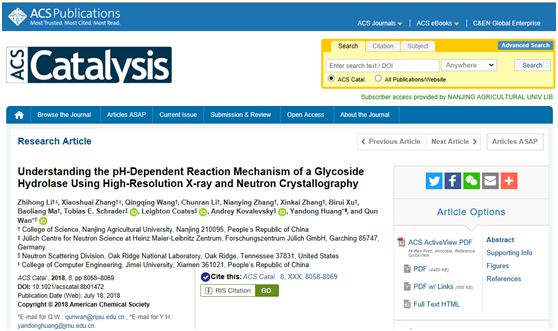 万群教授团队近日在ACS Catalysis发表了研究论文“Understanding the pH-Dependent Reaction Mechanism of a Glycoside Hydrolase Using High-Resolution X-ray and Neutron Crystallography”(影响因子11.384)。成人视频-亚洲成人在线-国产性爱视频