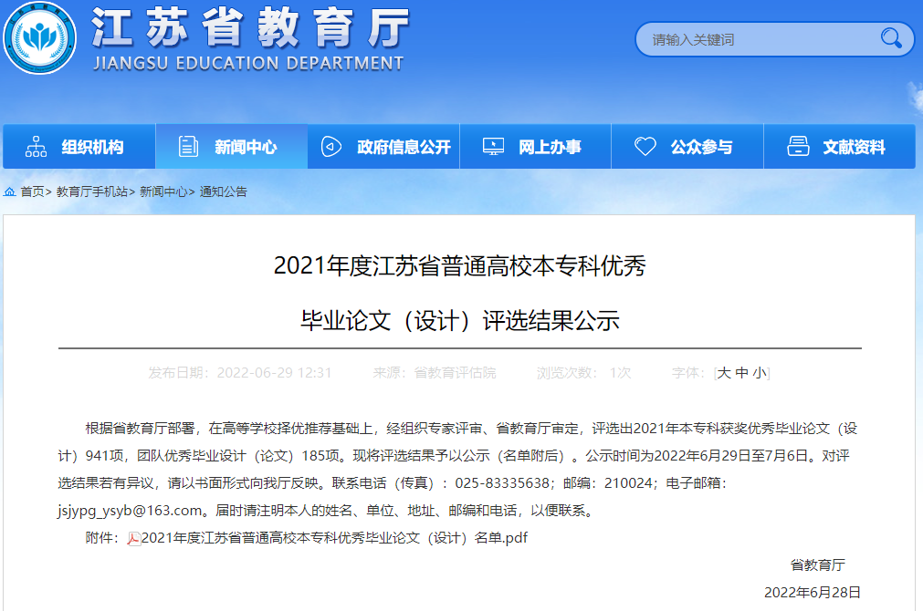 近日,江苏省教育厅公布了2021年度江苏省普通高校本科优秀毕业论文(设计)评选结果,我院化学系丁煜宾老师指导的2017级应化专业曹芝瑗同学的毕业论文《基于香豆素-吡啶荧光受体的金属离子阵列传感器研究》荣获一等奖。