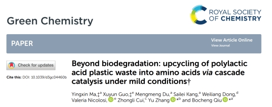 近日,我院邱博诚教授团队在国际著名学术期刊Green Chemistry发表题为:“Beyond biodegradation: upcycling of polylactic acid plastic wastes into amino acids via cascade catalysis under mild conditions”的论文,以废弃的聚乳酸塑料为原料,实现了在温和条件下高效产生高值化学品-丙氨酸。