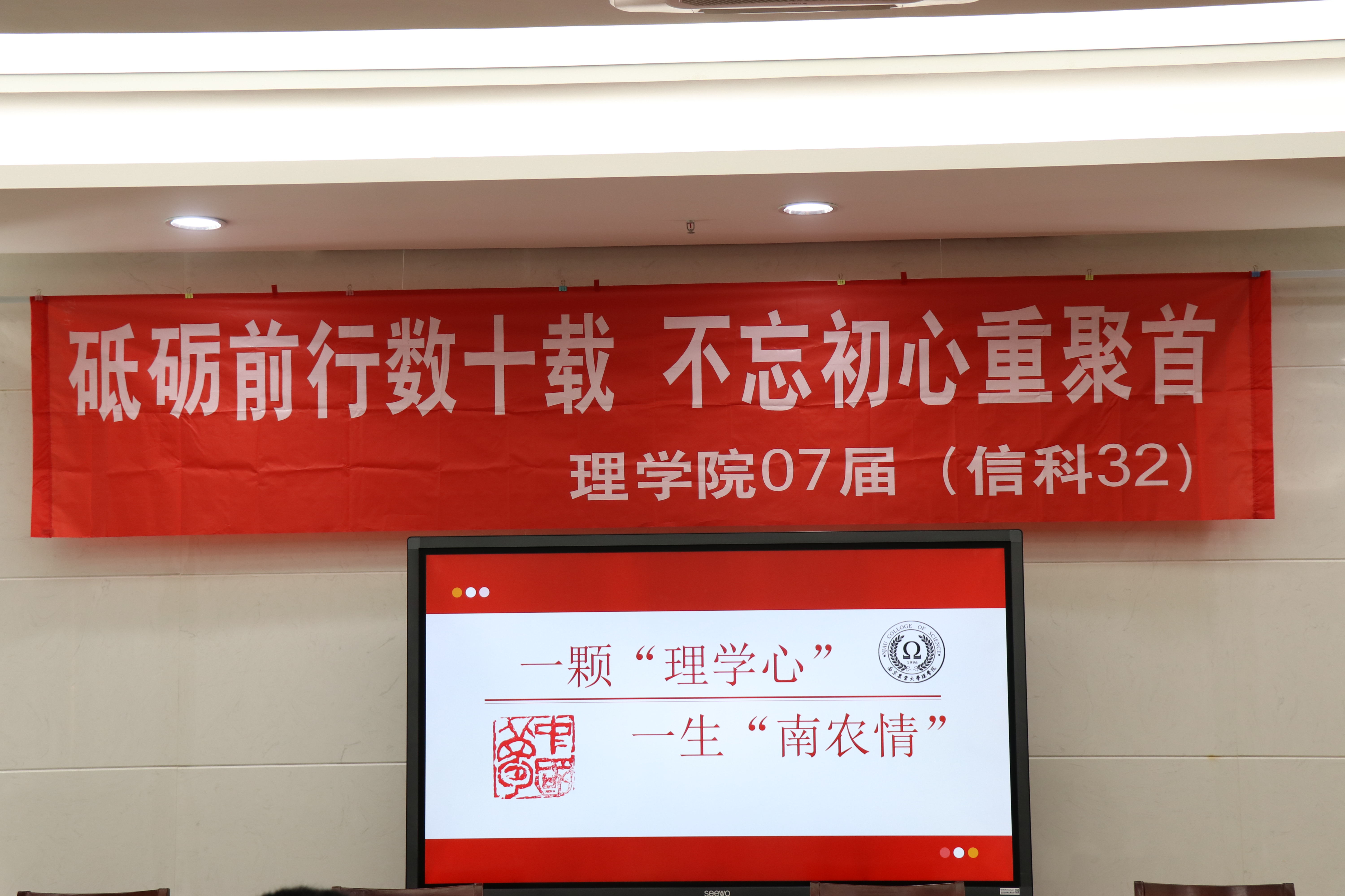 报告厅等待着这批优秀学子的到来。报告厅屏幕上放映着的是刘书记昨天晚上亲自制作的ppt,首张幻灯片上写着一句话:一颗“理学心”,一生“南农情”。老师们跟陆续到场的学长学姐们握手寒暄,之后坐下来一起回忆往事,十年光阴并没有冲淡这浓浓师生情。刘照云书记和朱震球老师看着那毕业照合影,依然能叫出同学们的名字来,在他们心中,很多记忆都不曾遗忘。