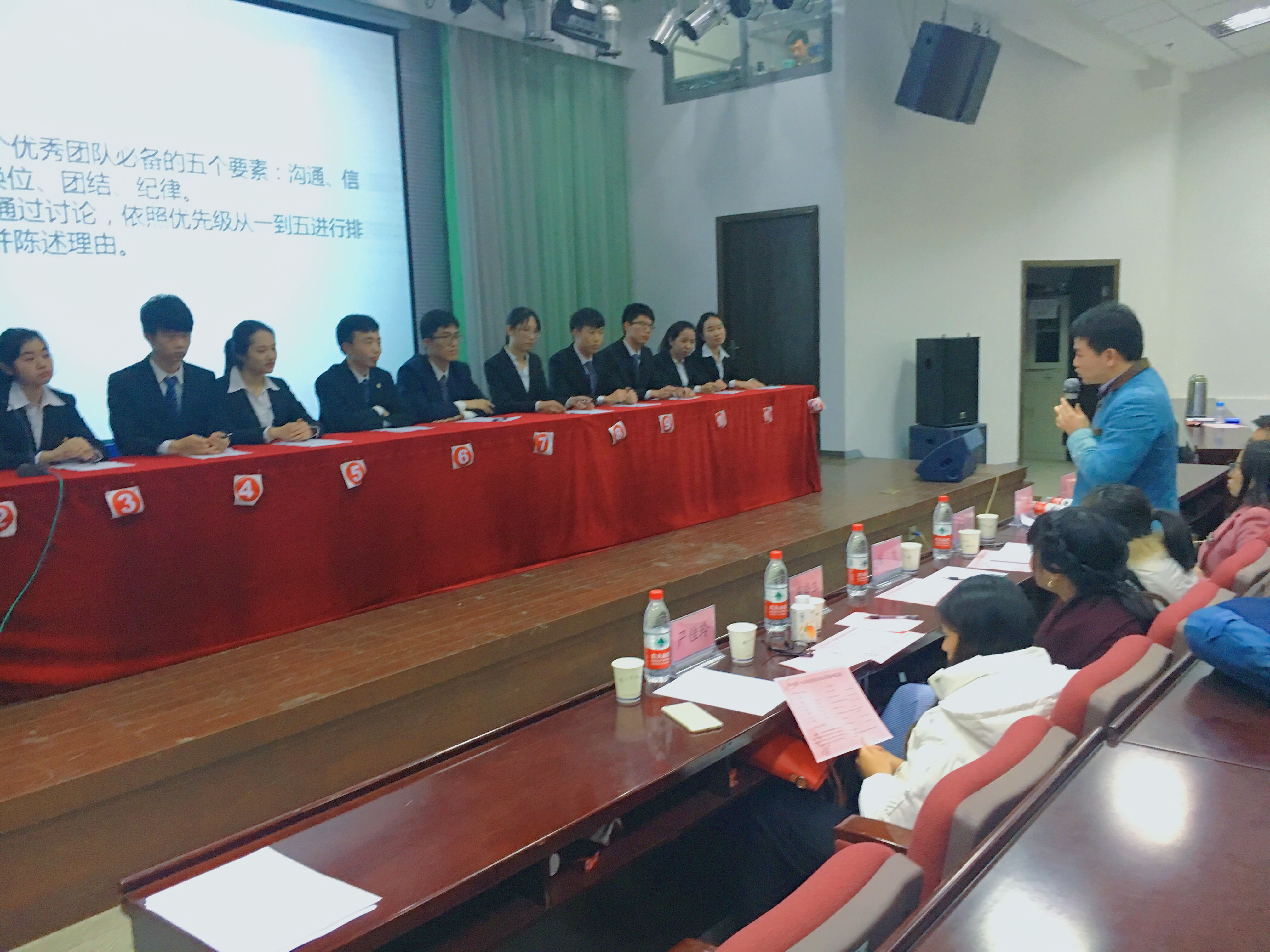 个人演讲结束后是无领导小组讨论环节。通过现场观众随机抽选,此次竞选者们讨论的题目是:“对优秀团队必备的五个要素给出排序”。经过轮流发言和紧张有序的自由讨论,最终团队给出了团结,沟通,信任,纪律,换位的顺序,并由陈悦同学总结发言。李长钦老师对此环节进行了点评,肯定了选手们在无领导小组讨论中的精彩表现,并就讨论的题目发表了自己的见解。随后现场所有的老师和学生结合选手表现,进行评选投票。