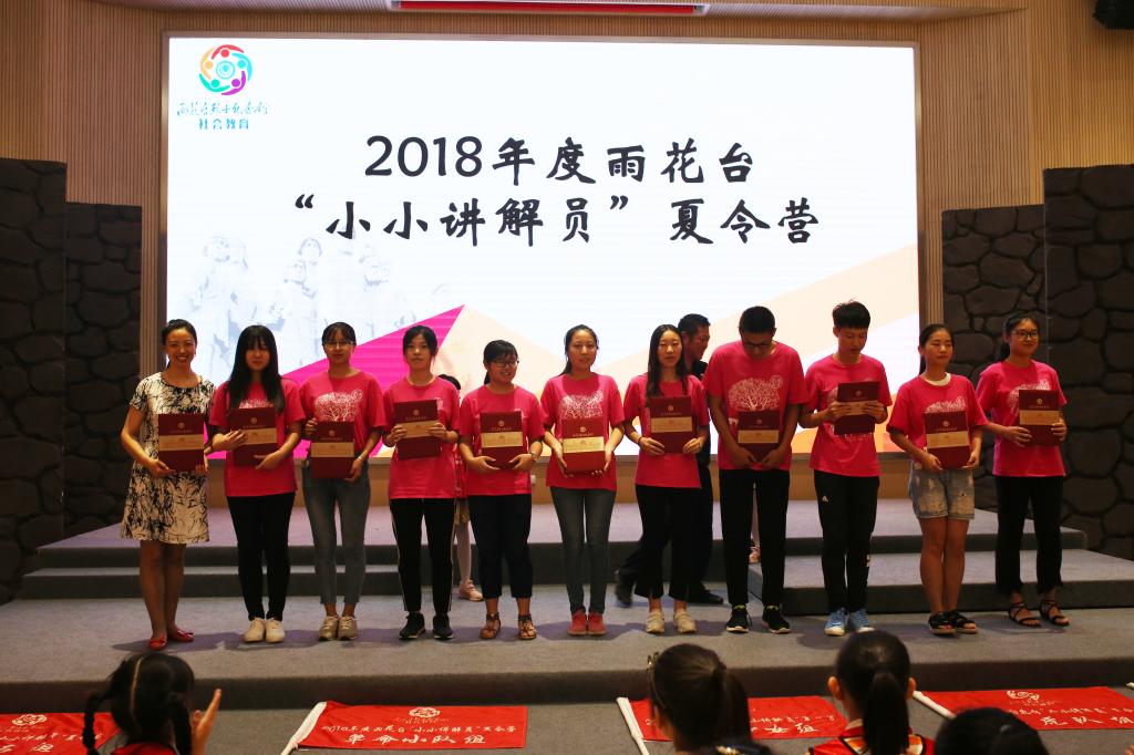 在8月19日举行的结营典礼上,我院荣获“优秀组织奖”,十二名团队志愿者代表荣获“优秀志愿者”称号。为期一周的“小小讲解员”夏令营之旅,旨在以青少年的视角讲述历史、弘扬雨花英烈精神,让孩子们进一步了解红色文化的同时,积极传承与弘扬,在未来的成长道路上逐步落实党的十九大精神,成为一名优秀的共产主义接班人。