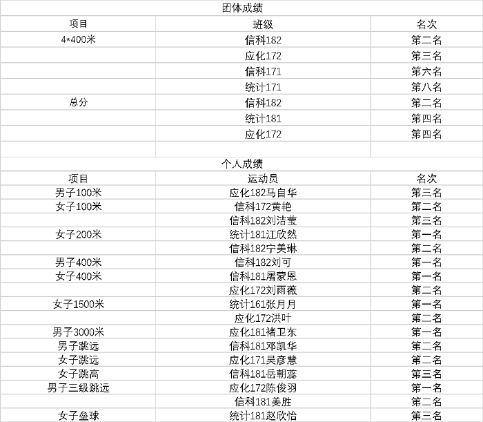 未经一番彻骨寒,怎能梅花扑鼻香。最终,在同学们的拼搏努力下,我院取得了优异的比赛成绩。在此,向所有获奖运动员表示祝贺。限于篇幅,个人成绩只列出了获得前三名的运动员。