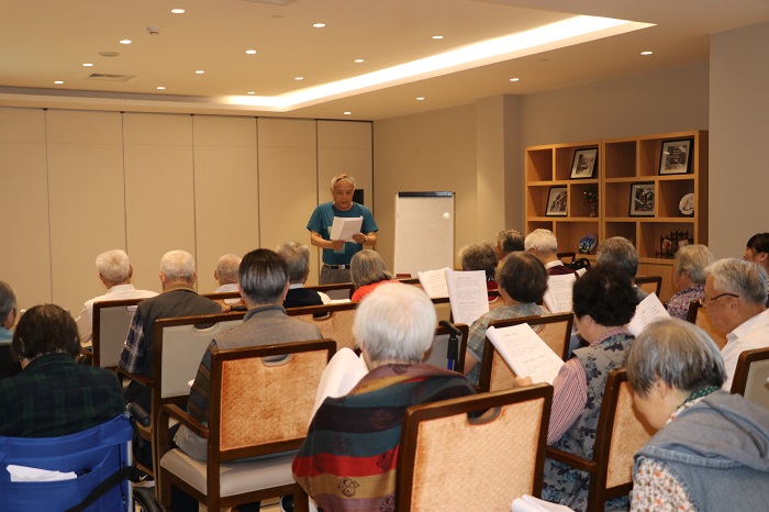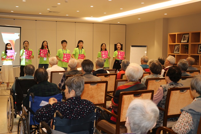 一首《北京有个金太阳》的合唱开启表演的序幕,熟悉的旋律回声嘹亮,带动起全场的氛围。而随着歌曲表演和朗诵节目的交替呈现,一曲曲动听而婉转的老歌、一首首抑扬顿挫的诗词,激发了老人们的兴趣,老人们不禁纷纷跟唱起来,朗读起来。而压轴歌曲《团结就是力量》一经演唱,便博得了老人们的共鸣。不知不觉间,老人们在振奋的歌声中回忆着自己意气风发的岁月。最后,在一曲《难忘今宵》的经典乐律里,实践小组成员们一同结束了他们的表演,也赢得了场下老人由衷的掌声和赞叹。在聊赖的夏日里,同学们用真情与行动,给老人们的生活带去了一抹青春的色彩。